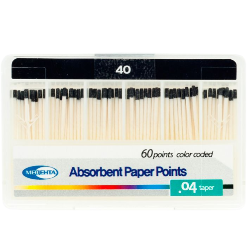 Для бумажных штифтов № 40 используется специальная экологически безопасная целлюлоза, обладающая высоким показателем гигроскопичности. Прочность обеспечивает целостность формы, что облегчает работу врача.