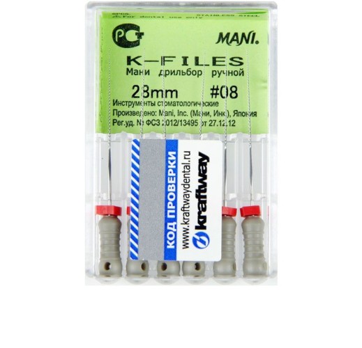 К-файл № 08 Mani длиной в 28 мм – ручной ротационный инструмент, применяемый для работы с зубными каналами. Они обеспечивают качественную механическую обработку, позволяя очищать, расширять и формовать их при помощи поступательных и вращательных движений.