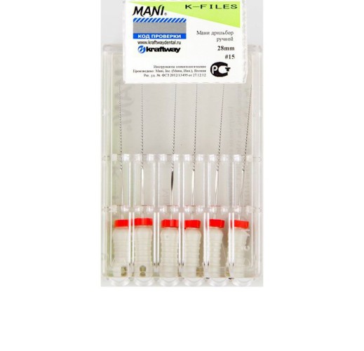 К-файл № 15 Mani – универсальный ручной инструмент, применяемый при эндодонтическом лечении запущенных случаев кариеса. При длине 28 мм они помогают очистить, расширить и сформовать вскрытые зубные каналы для их дальнейшего лечения и пломбирования.