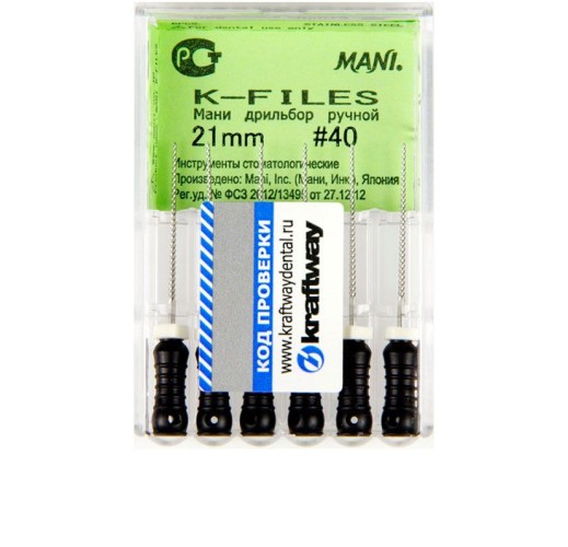 К-файл № 40 Mani – ручной эндодонтический инструмент, применяемый для чистки и дальнейшей формовки зубных каналов. Это позволяет эффективно подготовить их к дальнейшей промывке и герметизации пастами или штифтами.