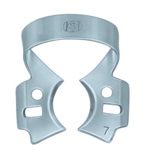 Чтобы облегчить снятие краев перфорации на боковых крыльях клампа № 7 предусмотрены отверстия овальной формы. Одна из его особенностей – наличие плоских боковых щечек.