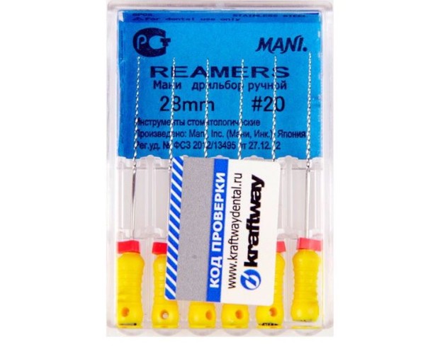 В римерах № 20 Mani применяется рабочая часть из высококачественной нержавеющей стали, она имеет спиральную нарезку, снимающую тонкие слои дентина. Пластиковая ручка обеспечивает точную и комфортную работу.