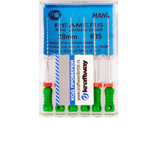 Ример № 35 Mani используется при эндодонтическом лечении для очистки и расширении зубных каналов. Процедура производится нажимом при вращении вправо до угла 90°, при этом дентин снимается тонкими ровными слоями.