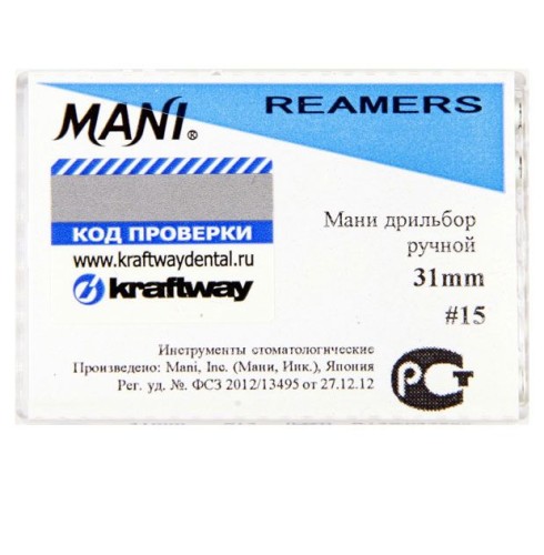 Ример № 15 Mani применяется для прохождения и расширения зубных каналов путем снятия ровных слоев дентина при вращении. Он обладает повышенной гибкостью и прочностью, поэтому легко проникает в искривленные каналы.
