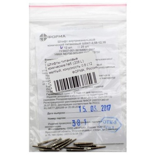 Титановые штифты № 5 208L от Форма – надёжное, высокопрочное конусное изделие, применяемое врачами стоматологами в процессе проведения терапевтических и ортопедических работ. Продукт используют в сочетании с искусственными конструкциями, изготовленными из керамики и металлокерамики.